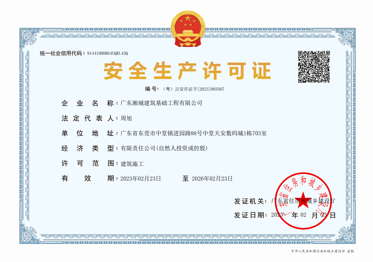 廣東湘城建筑基礎(chǔ)工程有限公司,成立于2016年,注冊資金4888萬元,持有地基基礎(chǔ)工程專業(yè)承包壹級資質(zhì),具有安全生產(chǎn)許可證。可承接各種基礎(chǔ)類施工,包括各類樁基礎(chǔ)、基坑支護(hù)、邊坡支護(hù)、地基強夯處理等施工業(yè)務(wù)。公司為地基與基礎(chǔ)工程專業(yè)承包、工程施工、技術(shù)咨詢、技術(shù)開發(fā)、技術(shù)服務(wù)、信息咨詢實體型企業(yè)。